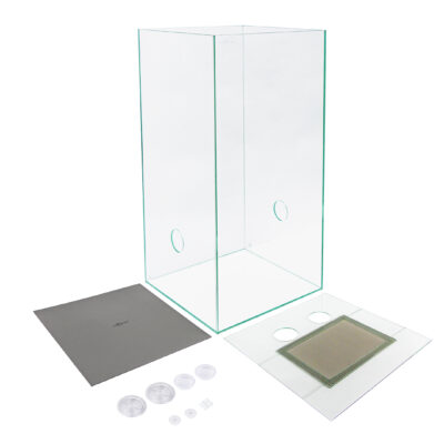Два 10-миллиметровых отверстия сбоку, расположенные на высоте 2 см (по центру) от дна, предназначены для слива лишней воды. Например, для слива воды можно использовать наш шланг прозрачный 10/06 мм. Два 50-миллиметровых отверстия могут быть закрыты заглушками, входящими в комплект, или служить дополнительной вентиляцией, если они оснащены решетчатыми вставками. Вы даже можете соединить здесь две установки с помощью акриловой трубки. Таким образом, если вы держите в виварии животных, они могут свободно перемещаться из одной установки в другую.