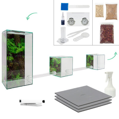 Táto rozšíriteľná štartovacia súprava pre všetky druhy mravcov listonohov obsahuje okrem optimálne prispôsobeného formikária aj vhodné príslušenstvo na chov týchto mravcov. Nádoby sa ľahko používajú na kŕmenie a čistenie. Veľké otvory (27 mm) a rúrky nielen uľahčujú pozorovanie mravcov, ale umožňujú zvieratám aj odstraňovať veľké kusy listov. Sieťové vložky z nehrdzavejúcej ocele zabezpečujú dobré vetranie a sú odolné proti mechanickým nárazom. Nedokážu nimi preniknúť ani veľké kolónie listonohov, ktoré veľmi rady režú. Robustné rúrkové spojky sú tiež absolútne odolné voči uhryznutiu. Teplomer a vlhkomer vo vnútri systému je absolútne odolný voči deťom a domácim zvieratám a umožňuje jednoduché sledovanie klimatických hodnôt. V prípade potreby možno vlhkosť vzduchu zvýšiť pomocou rozprašovača.